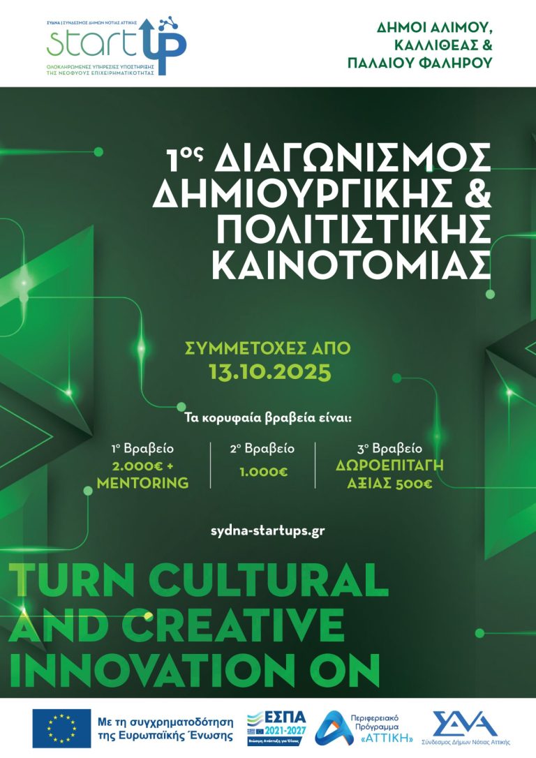 Ο Σύνδεσμος Δήμων Νότιας Αττικής (ΣυΔΝΑ) και η δράση υποστήριξης Νεοφυούς Επιχειρηματικότητας Sydna-Startups διοργανώνουν τον 1ο Διαγωνισμό Δημιουργικής