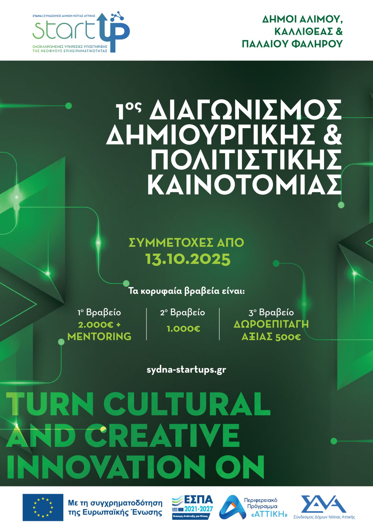 Ο Σύνδεσμος Δήμων Νότιας Αττικής (ΣυΔΝΑ) και η δράση υποστήριξης Νεοφυούς Επιχειρηματικότητας Sydna-Startups διοργανώνουν τον 1ο Διαγωνισμό Δημιουργικής & Πολιτιστικής Καινοτομίας o οποίος αποτελεί μια πρωτοποριακή δράση για την περιοχή και θέτει ως βασικούς άξονες τη σύνδεση της Νεοφυούς Επιχειρηματικότητας με την πολιτιστική δημιουργία, την τεχνολογία και την καινοτομία. Ο διαγωνισμός καινοτομίας επιδιώκει επίσης να αναδείξει έργα που ενσωματώνουν πολιτιστική κληρονομιά, ψηφιακές εφαρμογές, βιώσιμες πρακτικές και εμπειρίες τοπικού χαρακτήρα για τη δημιουργία αξίας και κοινωνικής συνοχής.
